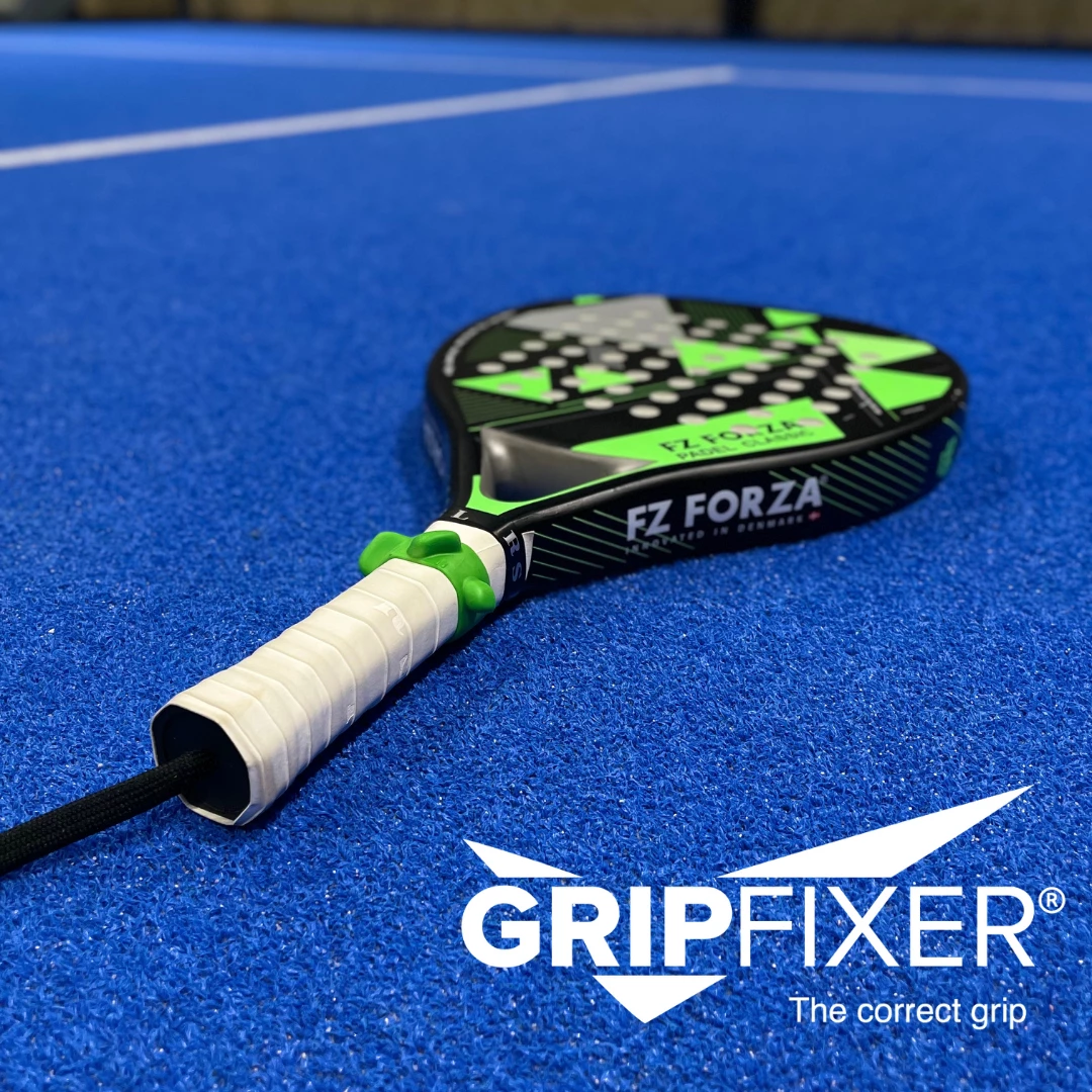 The Gripfixer is a tool that can help you learn to hold the racket correctly. Place it at the top of the grip where it helps you to hold the racket correctly keeping your hand in the right position. Be sure to choose the right version to suit which playing hand you use.