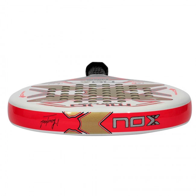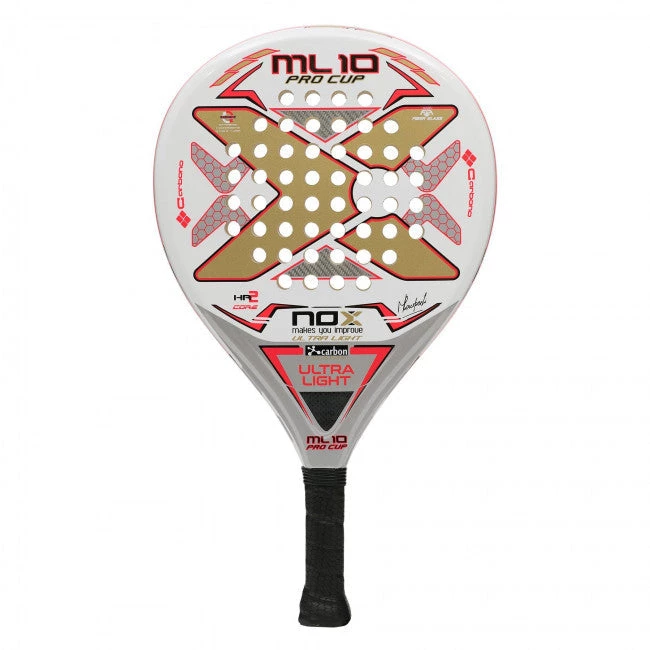 NOX ML10 Pro Cup Ultralight is a “take down” version of the popular NOX ML 10 padel racket. The concept of an Ultralight model is that it has been made more gentle to play with through a reduced weight and softer core. The racket’s weight is around 320 grams (+ – 15 grams in tolerance frame) and it offers a round head shape, which also helps to make the racket easy to play with. The racket has further been given a slightly smaller handle to accommodate women and juniors with slightly smaller hands. The grip size can always be adjusted by adding additional grips.