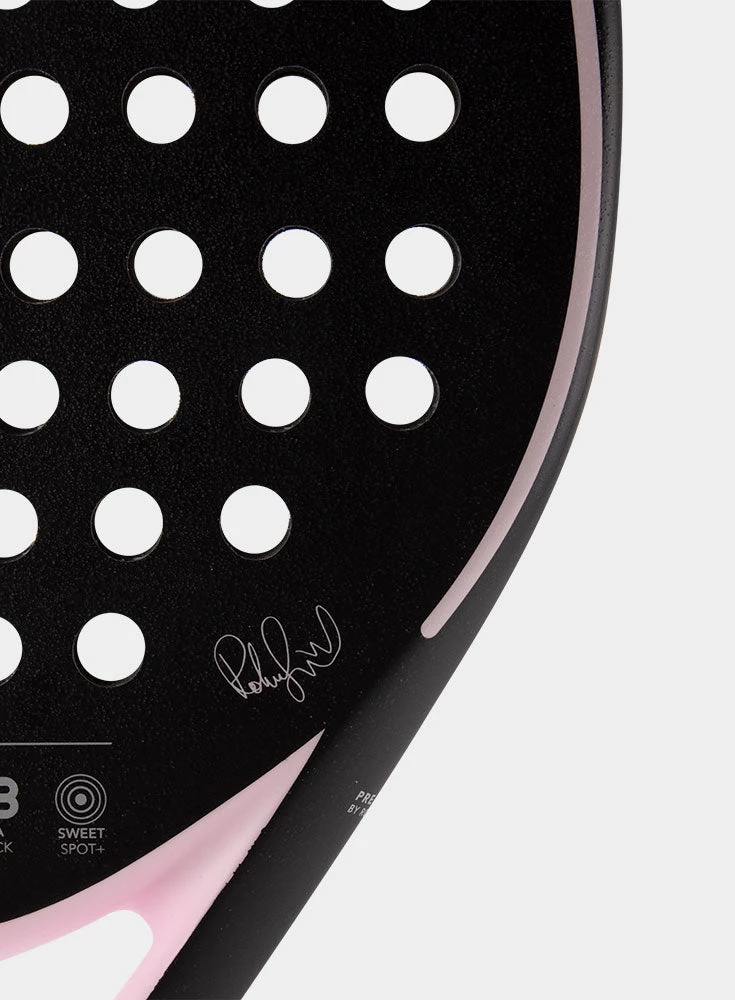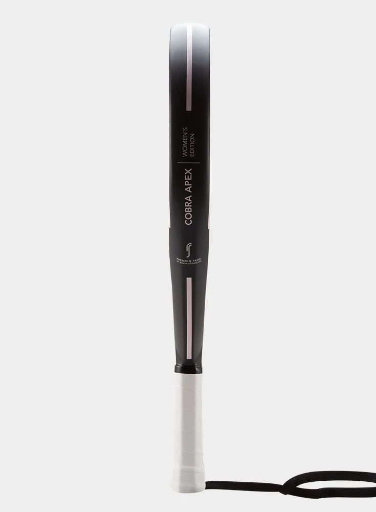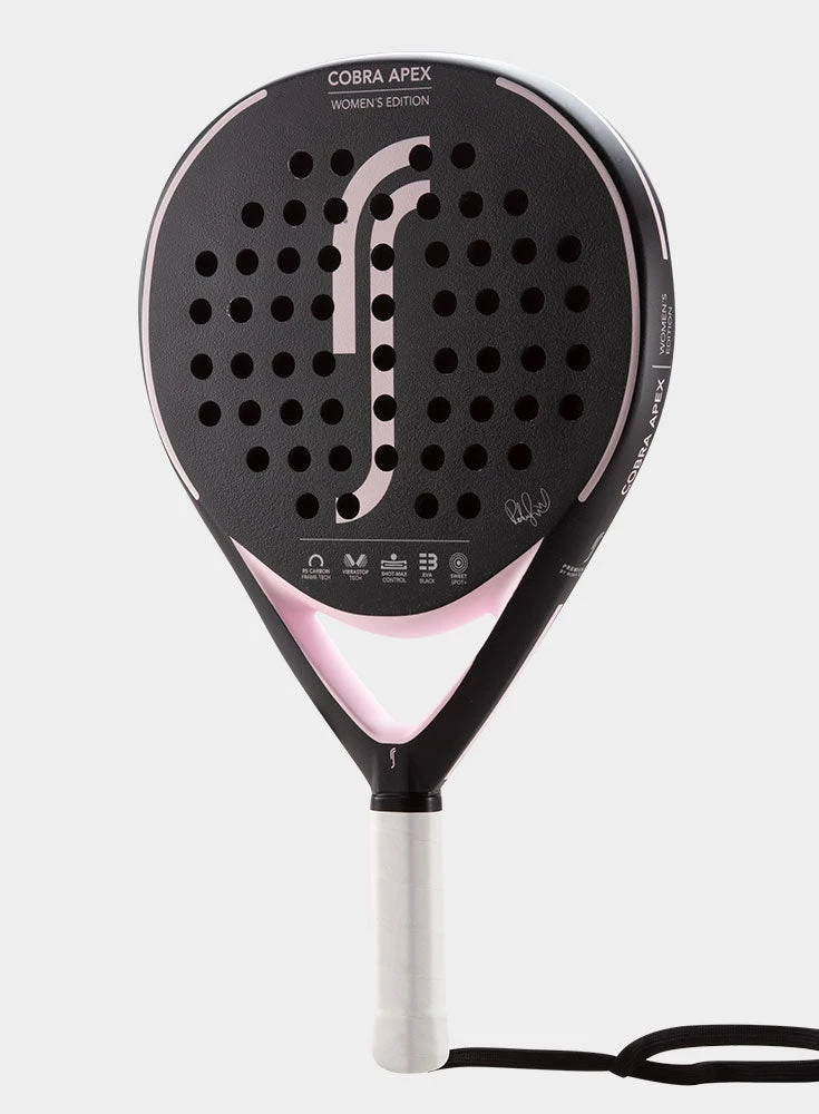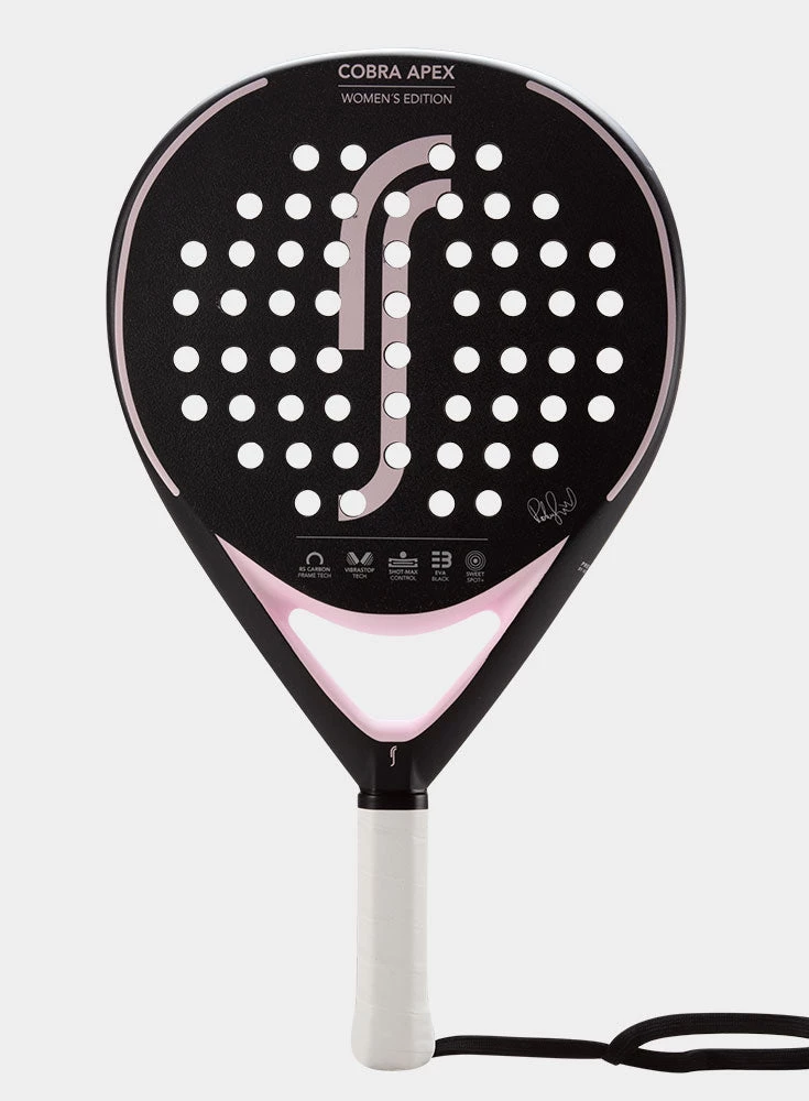 RS Cobra Apex Womens Edition Pink Padelbat. The Cobra Apex is the most powerful racket in the Cobra Series from RS. The construction is with a carbon frame that provides stability and security in the racket. The surface is in Japanese fiberglass, which makes the racket tolerant and easier to play with. This combination makes the racket usable for both the light and experienced player. The rough sand-like surface provides better feel when you strike the ball. The ratcket’s weight is 350gr, which provides good maneuverability.